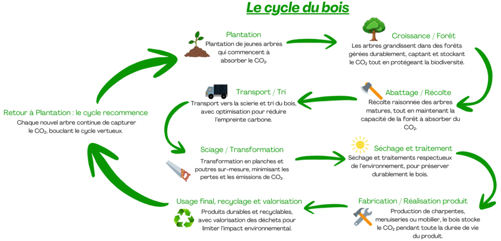 Le cycle du bois commence en forêt. Les arbres grandissent, absorbent du CO₂ et produisent de l’oxygène. Une fois à maturité, les experts récoltent le bois de manière contrôlée. Cette méthode préserve l’équilibre naturel de nos écosystèmes.