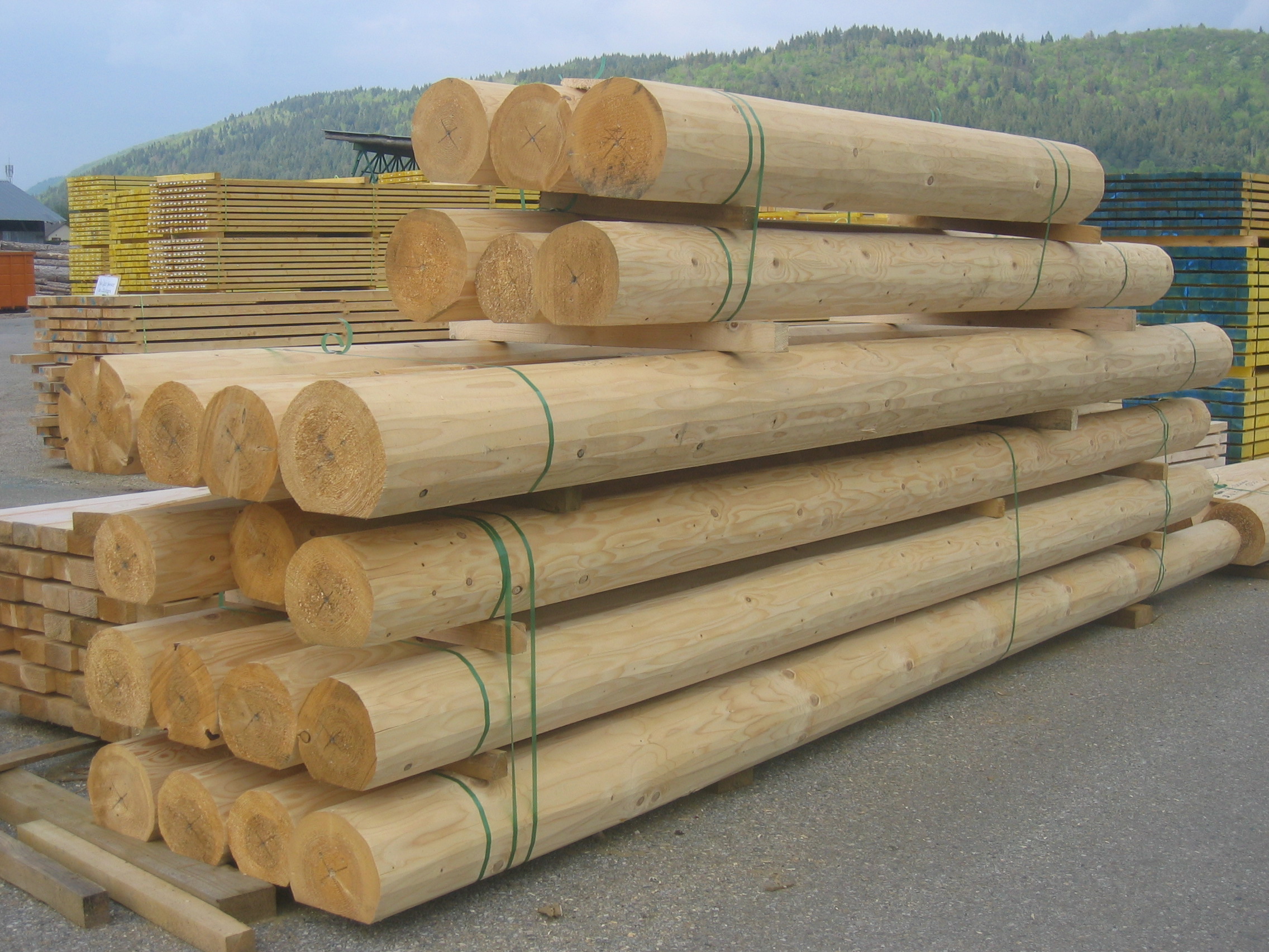 Ces produits sont disponibles du Ø 100 à 500 mm, en longueurs de 2 à 12 mètres. Ils peuvent être réalisés dans toutes les essences résineuses, ou même en lamellé-collé pour des besoins spécifiques.